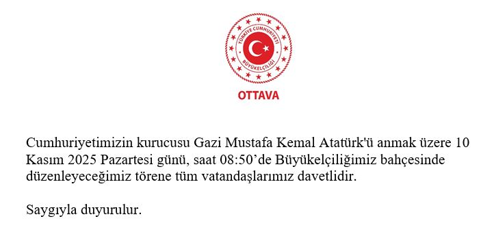 Cumhuriyetimizin kurucusu Gazi Mustafa Kemal Atatürk'ü anmak üzere 10 Kasım 2025 Pazartesi günü, saat 08:50’de Büyükelçiliğimiz bahçesinde düzenleyeceğimiz törene tüm vatandaşlarımız davetlidir.